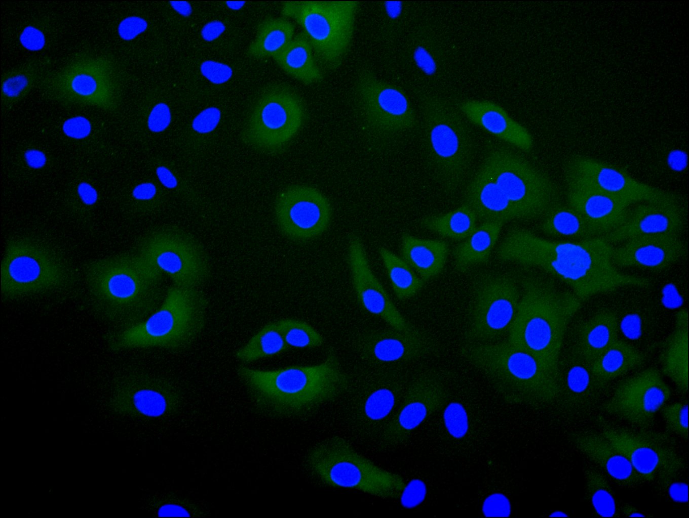 Immunofluorescence staining of A549 cell with CSB-RA023462MA1HU at 1:30 ,counter-stained with DAPI. The cells were fixed in 4% formaldehyde, permeabilized using 0.2% Triton X-100 and blocked in 10% normal Goat Serum. The cells were then incubated with the antibody overnight at 4°C. The secondary antibody was Fluorescein (FITC) AffiniPure Goat Anti-Human IgG, Fcγ fragment specific.