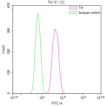 Overlay Peak curve showing SH-SY5Y cells stained with CSB-RA187464A0HU (red line) at 1:100. The cells were fixed in 4% formaldehyde and permeated by 0.2% TritonX-100 for 10min. Then 10% normal goat serum to block non-specific protein-protein interactions followed by the antibody (1ug/1*106cells) for 45min at 4℃. The secondary antibody used was FITC-conjugated goat anti-rabbit IgG (H+L) at 1/200 dilution for 35min at 4℃.Control antibody (green line) was Rabbit IgG (1ug/1*106cells) used under the same conditions. Acquisition of >10,000 events was performed.