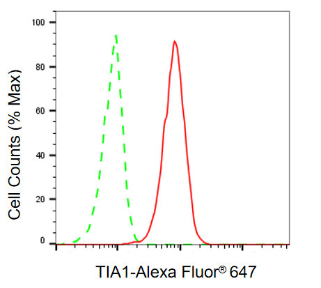 Flow cytometric analysis of TIA1 expression in HAP-1 cells using TIA1 antibody. Green, isotype control; red, TIA1.