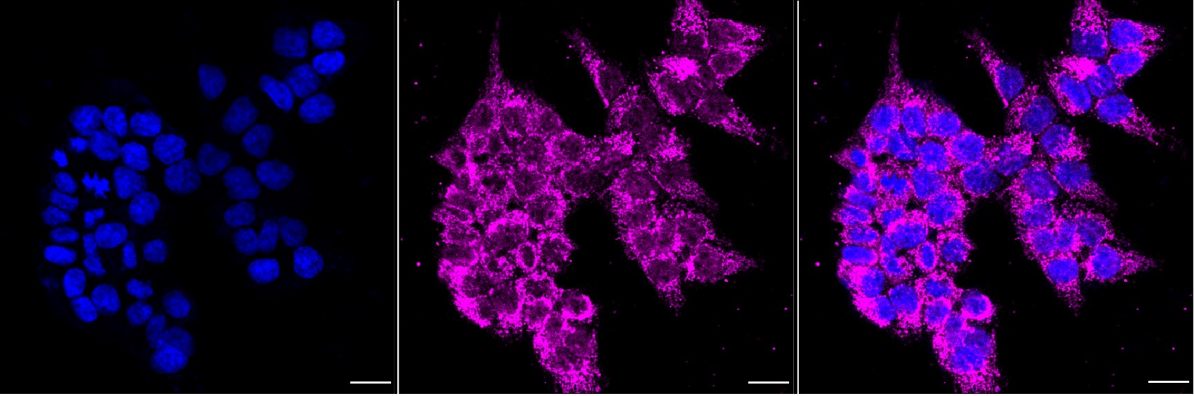 Immunocytochemical staining of HAP1 cells with TIMM50 antibody. Nuclei were stained blue with DAPI; was stained magenta with Alexa Fluor? 647. Images were taken using Leica stellaris 5. Protein abundance based on laser Intensity and smart gain: Medium. Scale bar, 20 μm.