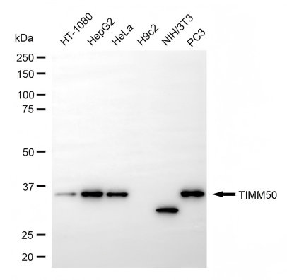 Western blotting analysis using TIMM50 antibody. Total cell lysates (30 μg) from various cell lines were loaded and separated by SDS-PAGE. The blot was incubated with TIMM50 antibody and HRP-conjugated goat anti-rabbit secondary antibody respectively.