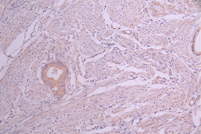 IHC image of CSB-RA023954MA1HU diluted at 1:50 and staining in paraffin-embedded human cervical cancer performed on a Leica BondTM system. After dewaxing and hydration, antigen retrieval was mediated by high pressure in a citrate buffer (pH 6.0). Section was blocked with 10% normal goat serum 30min at RT. Then primary antibody (1% BSA) was incubated at 4°C overnight. The primary is detected by a Anti-Human lgG, Fcy Fragment Specific labeled by HRP and visualized using 0.05% DAB.