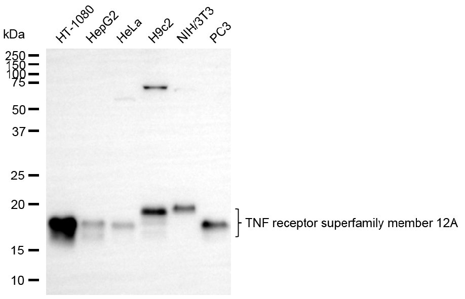 Western blotting analysis using TNF receptor superfamily member 12A antibody. Total cell lysates (30 μg) from various cell lines were loaded and separated by SDS-PAGE. The blot was incubated with TNF receptor superfamily member 12A antibody and HRP-conjugated goat anti-rabbit secondary antibody respectively.