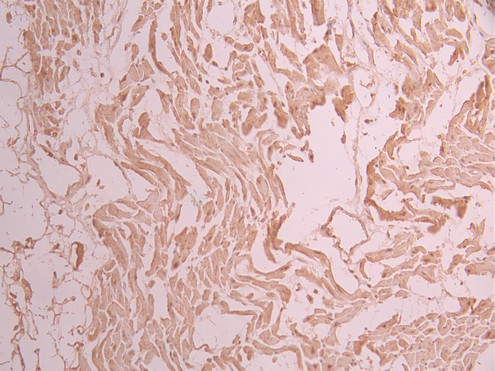 IHC image of CSB-RA448852A0HU diluted at 1:100 and staining in paraffin-embedded human heart tissue performed on a Leica BondTM system. After dewaxing and hydration, antigen retrieval was mediated by high pressure in a citrate buffer (pH 6.0). Section was blocked with 10% normal goat serum 30min at RT. Then primary antibody (1% BSA) was incubated at 4°C overnight. The primary is detected by a Goat anti-rabbit polymer IgG labeled by HRP and visualized using 0.05% DAB.