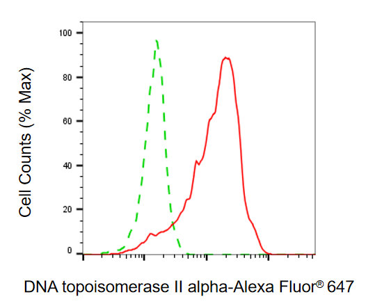 Flow cytometric analysis of DNA topoisomerase II alpha expression in HepG2 cells using DNA topoisomerase II alpha antibody. Green, isotype control; red, DNA topoisomerase II alpha.