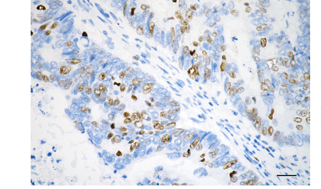 Immunohistochemistry was performed on paraffin-embedded human sigmoid colon carcinoma using DNA topoisomerase II alpha antibody. Antigen retrieval was done in sodium citrate buffer (pH 6.0). DAB was used for detection, with hematoxylin counterstaining. Images were acquired using a Nikon Ci-L Plus microscope (40× objective). Scale bar: 25 μm.