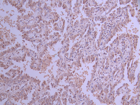 IHC image of CSB-RA021503A0HU diluted at 1:100 and staining in paraffin-embedded human lung cancer performed on a Leica BondTM system. After dewaxing and hydration, antigen retrieval was mediated by high pressure in a citrate buffer (pH 6.0). Section was blocked with 10% normal goat serum 30min at RT. Then primary antibody (1% BSA) was incubated at 4°C overnight. The primary is detected by a Goat anti-rabbit polymer IgG labeled by HRP and visualized using 0.05% DAB.