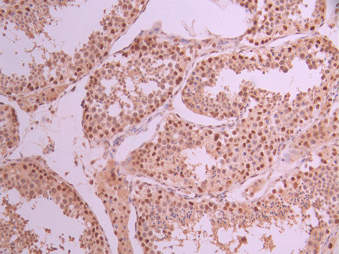 IHC image of CSB-RA021503A0HU diluted at 1:100 and staining in paraffin-embedded human testis tissue performed on a Leica BondTM system. After dewaxing and hydration, antigen retrieval was mediated by high pressure in a citrate buffer (pH 6.0). Section was blocked with 10% normal goat serum 30min at RT. Then primary antibody (1% BSA) was incubated at 4°C overnight. The primary is detected by a Goat anti-rabbit polymer IgG labeled by HRP and visualized using 0.05% DAB.