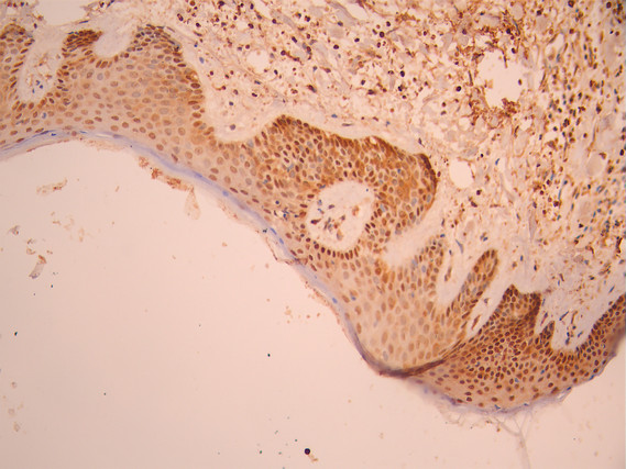 IHC image of CSB-RA261359A0HU diluted at 1:100 and staining in paraffin-embedded human skin tissue performed on a Leica BondTM system. After dewaxing and hydration, antigen retrieval was mediated by high pressure in a citrate buffer (pH 6.0). Section was blocked with 10% normal goat serum 30min at RT. Then primary antibody (1% BSA) was incubated at 4°C overnight. The primary is detected by a Goat anti-rabbit polymer IgG labeled by HRP and visualized using 0.05% DAB.