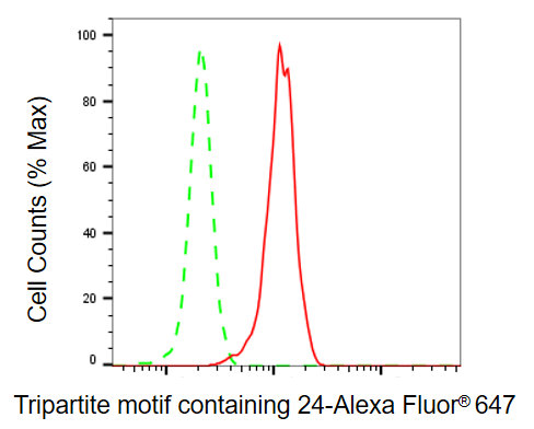 Flow cytometric analysis of tripartite motif containing 24 expression in HepG2 cells using tripartite motif containing 24 antibody. Green, isotype control; red, tripartite motif containing 24.