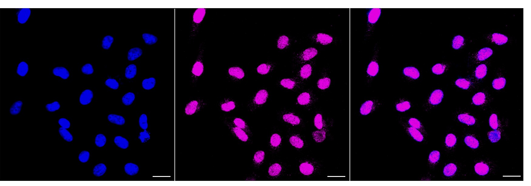 Immunocytochemical staining of HepG2 cells with Tripartite motif containing 24 antibody. Nuclei were stained blue with DAPI;Tripartite motif containing 24 was stained magenta with Alexa Fluor? 647. Images were taken using Leica stellaris 5. Protein abundance based on laser Intensity and smart gain: Medium. Scale bar, 20 μm.