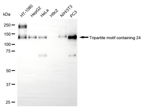 Western blotting analysis using tripartite motif containing 24 antibody. Total cell lysates (30 μg) from various cell lines were loaded and separated by SDS-PAGE. The blot was incubated with tripartite motif containing 24 antibody and HRP-conjugated goat anti-rabbit secondary antibody respectively.