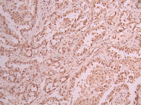 IHC image of CSB-RA930628A0HU diluted at 1:100 and staining in paraffin-embedded human lung cancer performed on a Leica BondTM system. After dewaxing and hydration, antigen retrieval was mediated by high pressure in a citrate buffer (pH 6.0). Section was blocked with 10% normal goat serum 30min at RT. Then primary antibody (1% BSA) was incubated at 4°C overnight. The primary is detected by a Goat anti-rabbit polymer IgG labeled by HRP and visualized using 0.05% DAB.