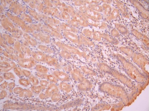 IHC image of CSB-RA223383A0HU diluted at 1:100 and staining in paraffin-embedded human stomach tissue performed on a Leica BondTM system. After dewaxing and hydration, antigen retrieval was mediated by high pressure in a citrate buffer (pH 6.0). Section was blocked with 10% normal goat serum 30min at RT. Then primary antibody (1% BSA) was incubated at 4°C overnight. The primary is detected by a Goat anti-rabbit polymer IgG labeled by HRP and visualized using 0.05% DAB.