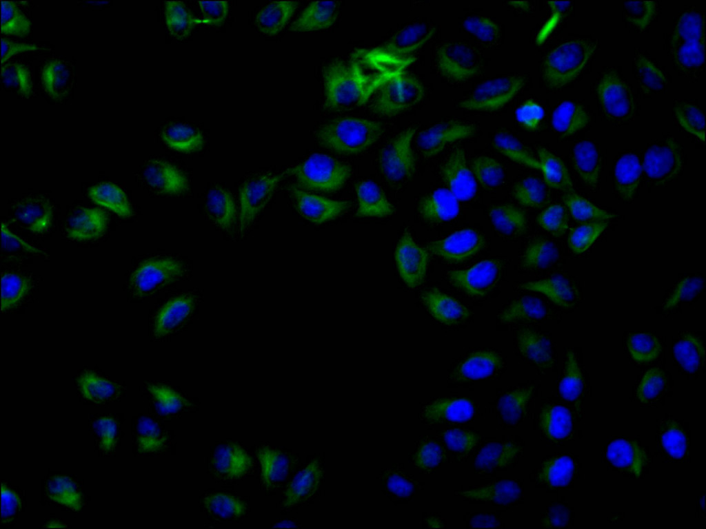Immunofluorescence staining of Hela cell with CSB-RA025318MA1HU at 1:100, counter-stained with DAPI. The cells were fixed in 4% formaldehyde and blocked in 10% normal Goat Serum. The cells were then incubated with the antibody overnight at 4C. The secondary antibody was FITC-conjugated AffiniPure Goat Anti-Human IgG(H+L).