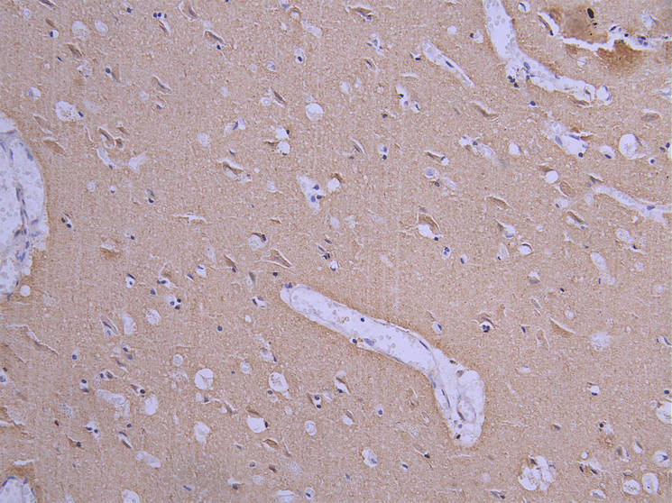 IHC image of CSB-RA008615MA1HU diluted at 1:200 and staining in paraffin-embedded human brain tissue performed on a Leica BondTM system. After dewaxing and hydration, antigen retrieval was mediated by high pressure in a citrate buffer (pH 6.0). Section was blocked with 10% normal goat serum 30min at RT. Then primary antibody (1% BSA) was incubated at 4°C overnight. The primary is detected by a Goat anti-human polymer IgG labeled by HRP and visualized using 0.05% DAB.