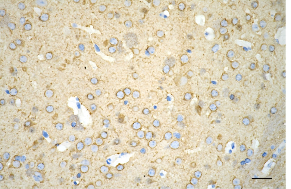 Immunohistochemistry was performed on paraffin-embedded mouse brain using beta tubulin III antibody. Antigen retrieval was done in sodium citrate buffer (pH 6.0). DAB was used for detection, with hematoxylin counterstaining. Images were acquired using a Nikon Ci-L Plus microscope (40× objective). Scale bar: 25 μm.