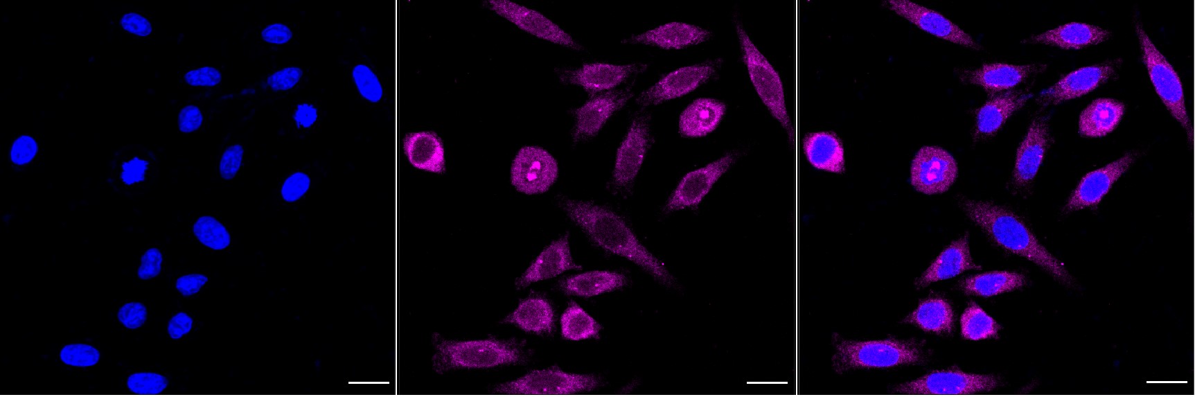 Immunocytochemical staining of HepG2 cells with Gamma Tubulin antibody. Nuclei were stained blue with DAPI; Gamma Tubulin was stained magenta with Alexa Fluor? 647. Images were taken using Leica stellaris 5. Protein abundance based on laser Intensity and smart gain: Medium. Scale bar, 20 μm.