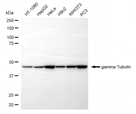 Western blotting analysis using gamma Tubulin antibody. Total cell lysates (30 μg) from various cell lines were loaded and separated by SDS-PAGE. The blot was incubated with gamma Tubulin antibody and HRP-conjugated goat anti-rabbit secondary antibody respectively.
