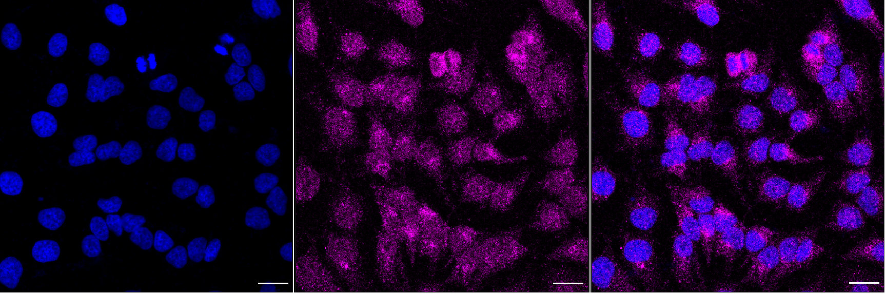 Immunocytochemical staining of Hela cells with thioredoxin reductase 2 antibody. Nuclei were stained blue with DAPI; Thioredoxin reductase 2 was stained magenta with Alexa Fluor? 647. Images were taken using Leica stellaris 5. Protein abundance based on laser Intensity and smart gain: Low. Scale bar, 20 μm.