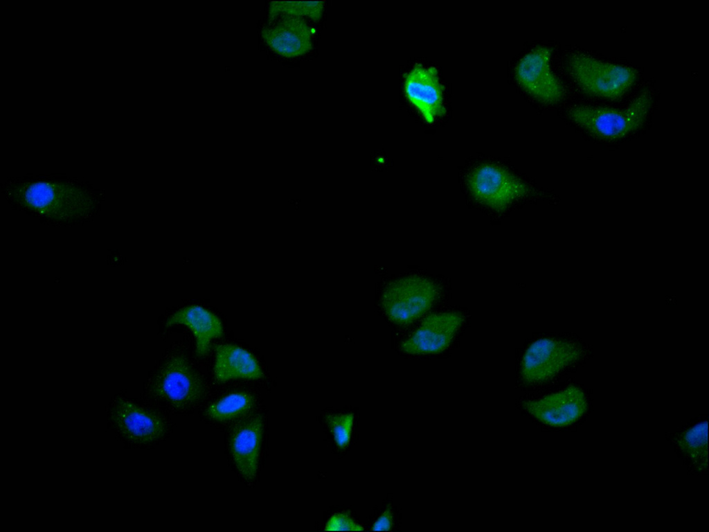 Immunofluorescence staining of Hela cell with CSB-RA833619A0HU at 1:50, counter-stained with DAPI. The cells were fixed in 4% formaldehyde, permeabilized using 0.2% Triton X-100 and blocked in 10% normal Goat Serum. The cells were then incubated with the antibody overnight at 4°C. The secondary antibody was Alexa Fluor 488-congugated AffiniPure Goat Anti-Rabbit IgG(H+L).