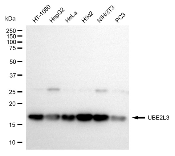 Western blotting analysis using UBE2L3 antibody. Total cell lysates (30 μg) from various cell lines were loaded and separated by SDS-PAGE. The blot was incubated with UBE2L3 antibody and HRP-conjugated goat anti-rabbit secondary antibody respectively.