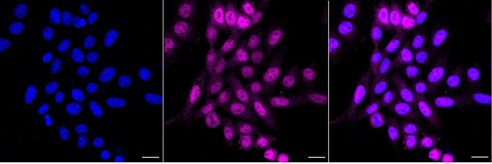 Immunocytochemical staining of HepG2 cells with Ubiquitination factor E4 B antibody.Nuclei were stained blue with DAPI; Ubiquitination factor E4 B was stained magenta with Alexa Fluor? 647. Images were taken using Leica stellaris 5. Protein abundance based on laser Intensity and smart gain: Medium. Scale bar, 20 μm.