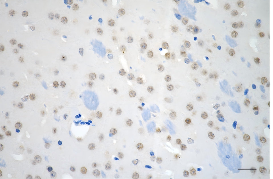 Immunohistochemistry was performed on paraffin-embedded mouse brain using ubiquitination factor E4B antibody. Antigen retrieval was done in sodium citrate buffer (pH 6.0). DAB was used for detection, with hematoxylin counterstaining. Images were acquired using a Nikon Ci-L Plus microscope (40× objective). Scale bar: 25 μm.