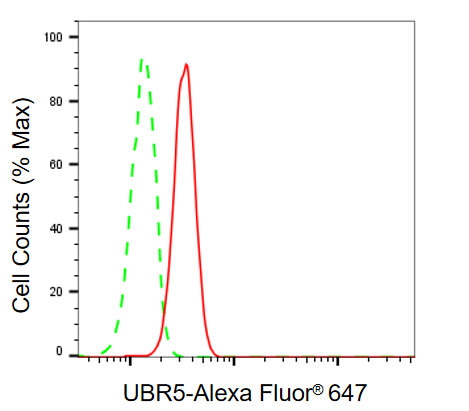 Flow cytometric analysis of UBR5 expression in HT-1080 cells using UBR5 antibody. Green, isotype control; red, UBR5.