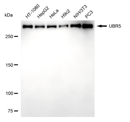 Western blotting analysis using UBR5 antibody. Total cell lysates (30 μg) from various cell lines were loaded and separated by SDS-PAGE. The blot was incubated with UBR5 antibody and HRP-conjugated goat anti-rabbit secondary antibody respectively.