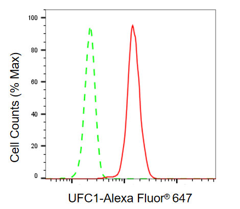 Flow cytometric analysis of UFC1 expression in HeLa cells using UFC1 antibody. Green, isotype control; red, UFC1.