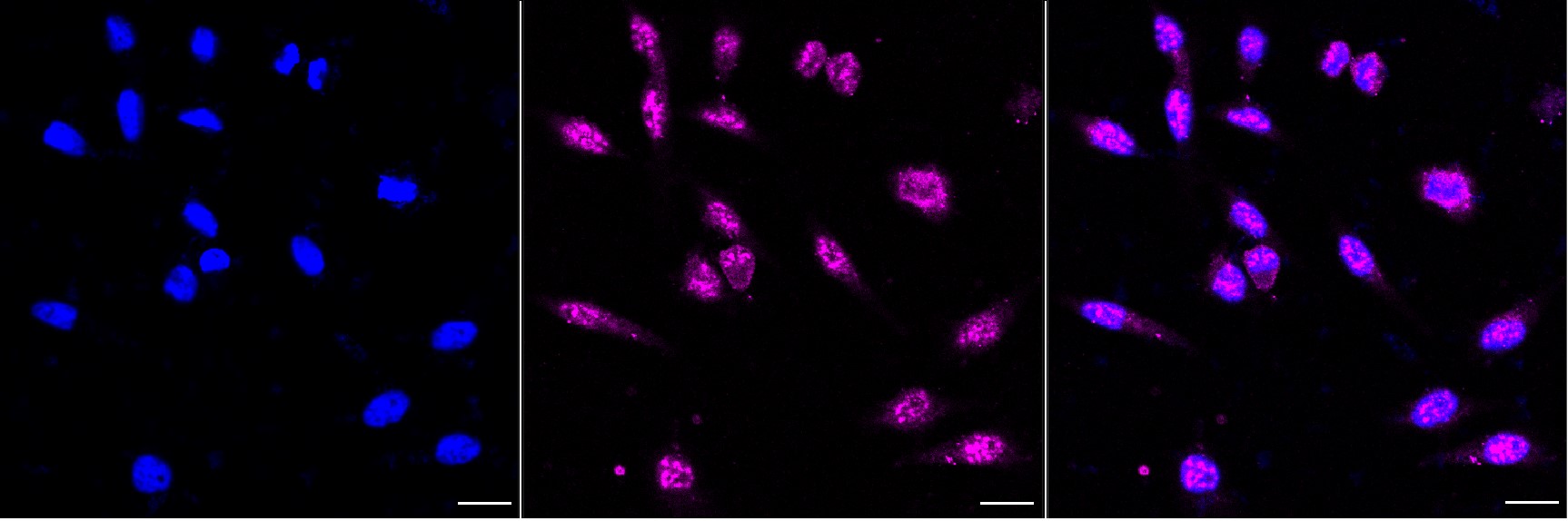 Immunocytochemical staining of HeLa cells with UFC1 antibody. Nuclei were stained blue with DAPI; UFC1 was stained magenta with Alexa Fluor? 647. Images were taken using Leica stellaris 5. Protein abundance based on laser Intensity and smart gain: Low. Scale bar, 20 μm.