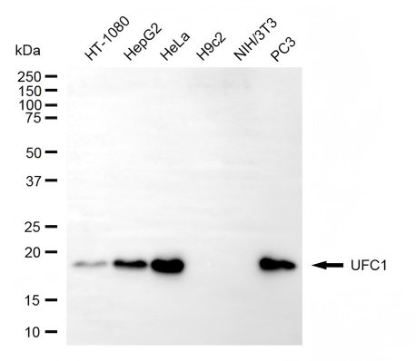 Western blotting analysis using UFC1 antibody. Total cell lysates (30 μg) from various cell lines were loaded and separated by SDS-PAGE. The blot was incubated with UFC1 antibody and HRP-conjugated goat anti-rabbit secondary antibody respectively.