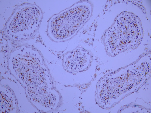 IHC image of CSB-RA981712A0HU diluted at 1:100 and staining in paraffin-embedded human testis tissue performed on a Leica BondTM system. After dewaxing and hydration, antigen retrieval was mediated by high pressure in a citrate buffer (pH 6.0). Section was blocked with 10% normal goat serum 30min at RT. Then primary antibody (1% BSA) was incubated at 4°C overnight. The primary is detected by a Goat anti-rabbit polymer IgG labeled by HRP and visualized using 0.05% DAB.
