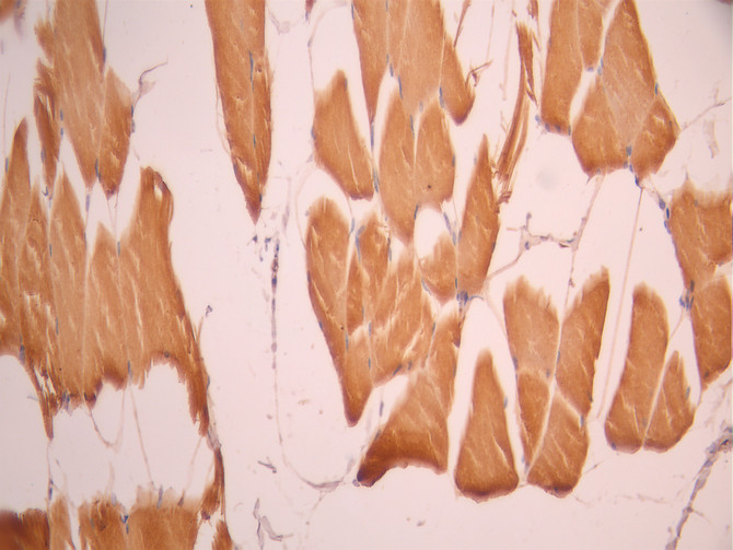 IHC image of CSB-RA057250A0HU diluted at 1:100 and staining in paraffin-embedded human skeletal muscle tissue performed on a Leica BondTM system. After dewaxing and hydration, antigen retrieval was mediated by high pressure in a citrate buffer (pH 6.0). Section was blocked with 10% normal goat serum 30min at RT. Then primary antibody (1% BSA) was incubated at 4°C overnight. The primary is detected by a Goat anti-rabbit polymer IgG labeled by HRP and visualized using 0.05% DAB.