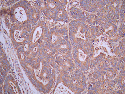 IHC image of CSB-RA057250A0HU diluted at 1:100 and staining in paraffin-embedded human colorectal cancer performed on a Leica BondTM system. After dewaxing and hydration, antigen retrieval was mediated by high pressure in a citrate buffer (pH 6.0). Section was blocked with 10% normal goat serum 30min at RT. Then primary antibody (1% BSA) was incubated at 4°C overnight. The primary is detected by a Goat anti-rabbit polymer IgG labeled by HRP and visualized using 0.05% DAB.