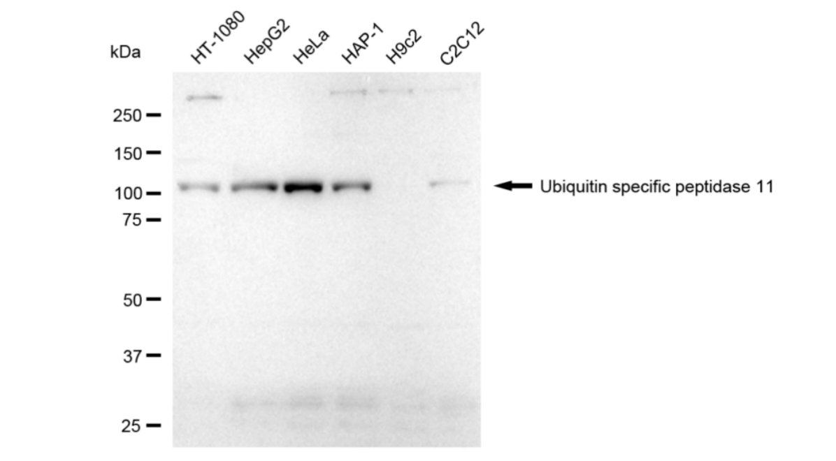 Western blotting analysis using ubiquitin specific peptidase 11? antibody. Total cell lysates (30 μg) from various cell lines were loaded and separated by SDS-PAGE. The blot was incubated with ubiquitin specific peptidase 11? antibody and HRP-conjugated goat anti-rabbit secondary antibody respectively.