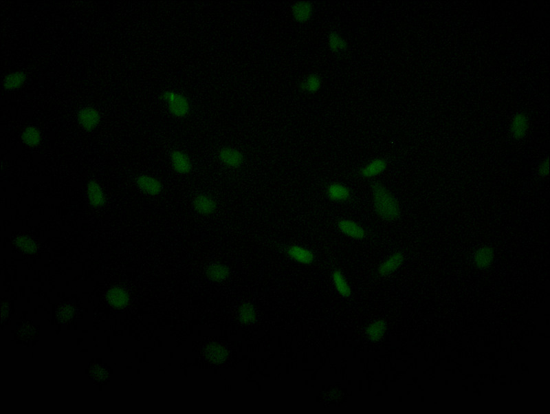 Immunofluorescence staining of MCF-7 with CSB-RA067358A0HU at 1:30, counter-stained with DAPI. The cells were fixed in 4% formaldehyde and blocked in 10% normal Goat Serum. The cells were then incubated with the antibody overnight at 4°C. The secondary antibody was Alexa Fluor 493-congugated AffiniPure Goat Anti-Rabbit IgG(H+L).