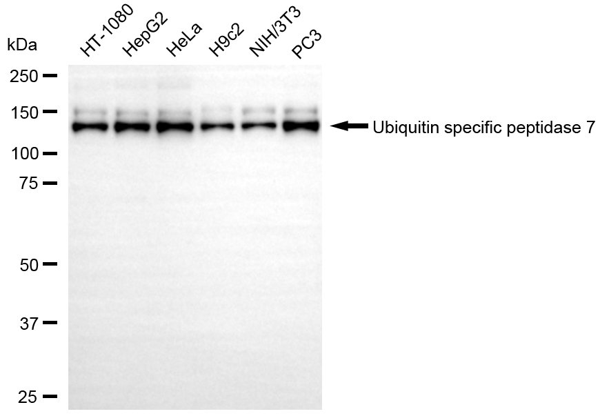 Western blotting analysis using ubiquitin specific peptidase 7 antibody. Total cell lysates (30 μg) from various cell lines were loaded and separated by SDS-PAGE. The blot was incubated with ubiquitin specific peptidase 7 antibody and HRP-conjugated goat anti-rabbit secondary antibody respectively.