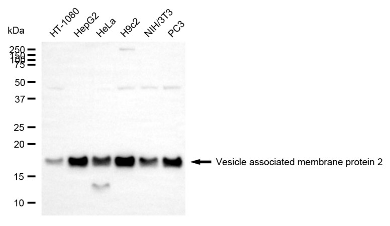 Western blotting analysis using vesicle associated membrane protein 2 antibody. Total cell lysates (30 μg) from various cell lines were loaded and separated by SDS-PAGE. The blot was incubated with vesicle associated membrane protein 2 antibody and HRP-conjugated goat anti-rabbit secondary antibody respectively.