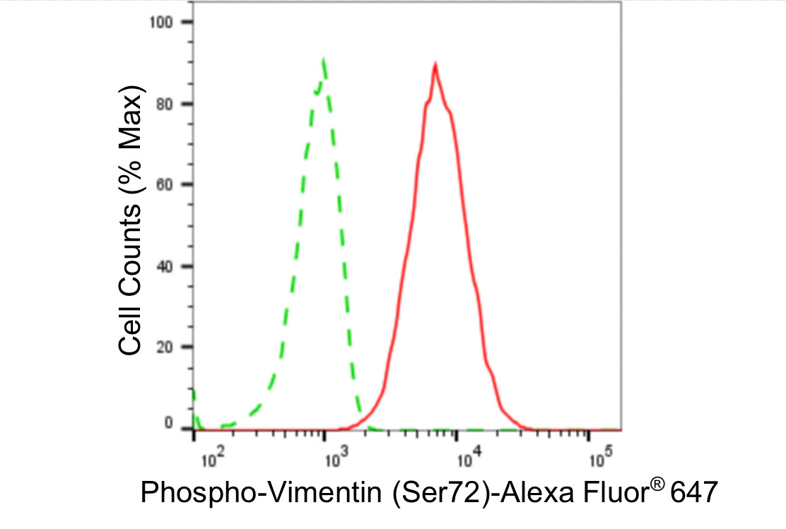 Flow cytometric analysis of Phospho-Vimentin (Ser72) expression in HT-1080 cells using Phospho-Vimentin (Ser72) antibody. Green, isotype control; red, Phospho-Vimentin (Ser72).