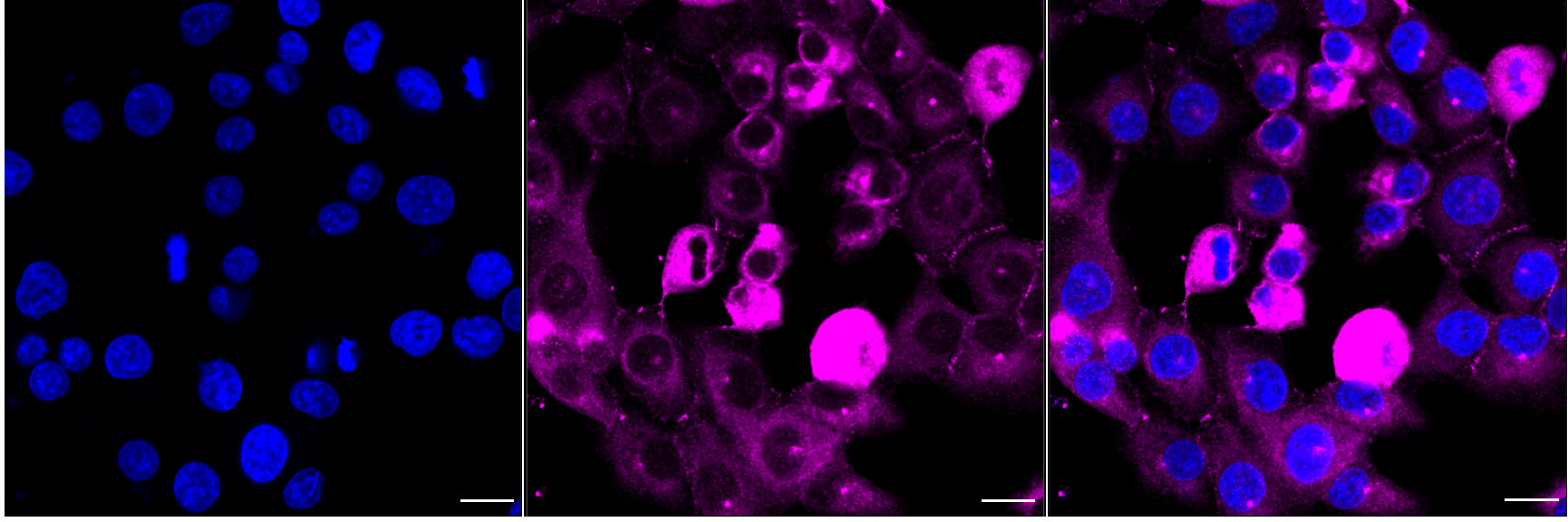 Immunocytochemical staining of HT-1080 cells with Phospho-Vimentin (Ser72) antibody. Nuclei were stained blue with DAPI; Phospho-Vimentin (Ser72) was stained magenta with Alexa Fluor? 647. Images were taken using Leica stellaris 5. Protein abundance based on laser Intensity and smart gain: High. Scale bar, 20 μm.