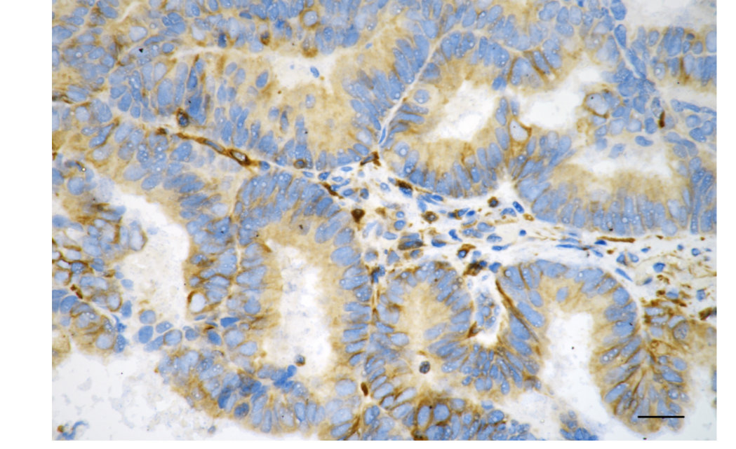 Immunohistochemistry was performed on paraffin-embedded human endometrial carcinoma using phospho-vimentin (Ser72) antibody. Antigen retrieval was done in sodium citrate buffer (pH 6.0). DAB was used for detection, with hematoxylin counterstaining. Images were acquired using a Nikon Ci-L Plus microscope (40× objective). Scale bar: 25 μm.