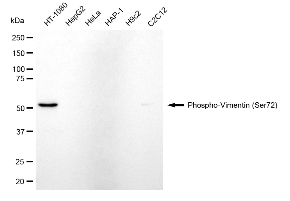 Western blotting analysis using phospho-vimentin (Ser72) antibody. Total cell lysates (30 μg) from various cell lines were loaded and separated by SDS-PAGE. The blot was incubated with phospho-vimentin (Ser72) antibody and HRP-conjugated goat anti-rabbit secondary antibody respectively.