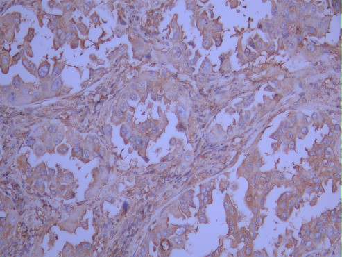 IHC image of CSB-RA147408A0HU diluted at 1:100 and staining in paraffin-embedded human lung cancer performed on a Leica BondTM system. After dewaxing and hydration, antigen retrieval was mediated by high pressure in a citrate buffer (pH 6.0). Section was blocked with 10% normal goat serum 30min at RT. Then primary antibody (1% BSA) was incubated at 4°C overnight. The primary is detected by a Goat anti-rabbit polymer IgG labeled by HRP and visualized using 0.05% DAB.