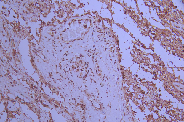 IHC image of CSB-RA076471A0HU diluted at 1:100 and staining in paraffin-embedded human glioma cancer performed on a Leica BondTM system. After dewaxing and hydration, antigen retrieval was mediated by high pressure in a citrate buffer (pH 6.0). Section was blocked with 10% normal goat serum 30min at RT. Then primary antibody (1% BSA) was incubated at 4°C overnight. The primary is detected by a Goat anti-rabbit polymer IgG labeled by HRP and visualized using 0.05% DAB.