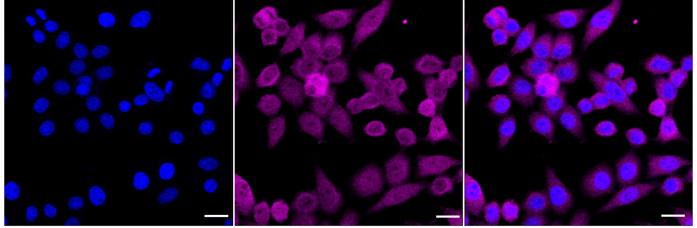 Immunocytochemical staining of HepG2 cells with Phospho-YAP1 (S127) antibody. Nuclei were stained blue with DAPI; Phospho-YAP1 (S127) was stained magenta with Alexa Fluor? 647. Images were taken using Leica stellaris 5. Protein abundance based on laser Intensity and smart gain: High. Scale bar: 20 μm.