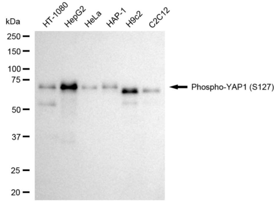 Western blotting analysis using phospho-YAP1 (S127) antibody. Total cell lysates (30 μg) from various cell lines were loaded and separated by SDS-PAGE. The blot was incubated with phospho-YAP1 (S127) antibody and HRP-conjugated goat anti-rabbit secondary antibody respectively.