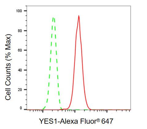 Flow cytometric analysis of YES1 expression in HepG2 cells using YES1 antibody. Green, isotype control; red, YES1.