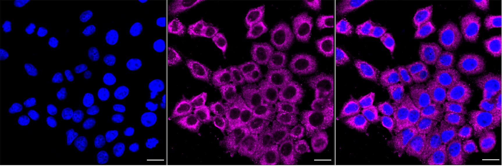 Immunocytochemical staining of HepG2 cells with YES1 antibody. Nuclei were stained blue with DAPI; YES1 was stained magenta with Alexa Fluor? 647. Images were taken using Leica stellaris 5. Protein abundance based on laser Intensity and smart gain: Medium. Scale bar, 20 μm.